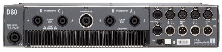 Усилитель 4x2600 Вт/4 Ом с контроллером: цветной сенсорный дисплей, предустановки для всех АС d&b, пароль, 32 полосный граф. EQ, фильтры, delay. Дистанционное управление Ethernet/CAN. Входы: аналог/AES. 2U, вес 19кг. Разъем NL4.