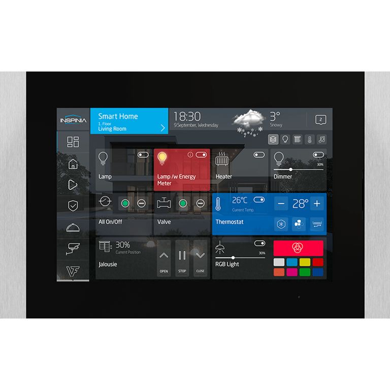 Inspinia SQ 10"– настенная сенсорная панель с функциями логического контроллера, сервера визуализации для бесплатного облачного мобильного приложения и межпротокольного шлюза. Поддержка протоколов KNX, Modbus, BACnet, MQTT, ZigBee, BLE, функции IP-интеркома.