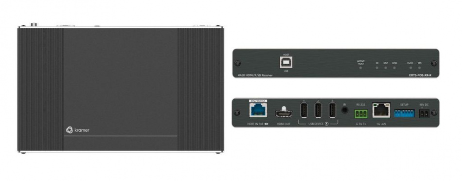 EXT3-POE-XR-R — приёмник сигналов HDMI c разрешением до 4K@60 Гц (4:4:4), а также сигналов USB, Ethernet, RS-232 и ИК по кабелю витой пары HDBaseT 3.0.