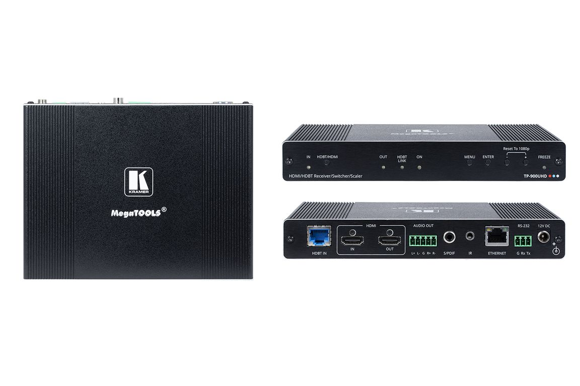 TP-900UHD — приемник сигналов HDBaseT (по кабелю на витой паре) или стандартных сигналов HDMI, с обеспечением бесподрывности сигнала на выходе. Прибор может использоваться с матричными коммутаторами (не имеющими собственной технологии бесподрывного переключения) для получения результирующего сигнала без появления черного экрана, подрывов и артефактов в момент коммутации. TP-900UHD скрывает этот момент за коротким стоп-кадром, практически незаметном для наблюдателя (особенно на статичных сценах). Для этого режима работы достаточно использовать один из входов прибора. При использовании в качестве коммутатора TP-900UHD реализует функции автоматического выбора входа. При включении «режима приоритета» потеря сигнала с основного источника приведёт к автоматическому переключению на резервный вход, восстановление сигнала — к обратному переключению. В «режиме последнего подключения» прибор будет выбирать вход, на котором сигнал появился последним. При коммутации входов также обеспечивается бесподрывность. Прибор осуществляет понижающее и повышающее масштабирование сигнала, поддерживая постоянный сигнал на выходе. Для входа HDBaseT прибор обеспечивает приём видео/аудио потока, а также ретрансляцию Ethernet, интерфейса RS-232 и сигналов ИК по кабелю на витой паре (при условии работы с совместимым передатчиком HDBaseT).
